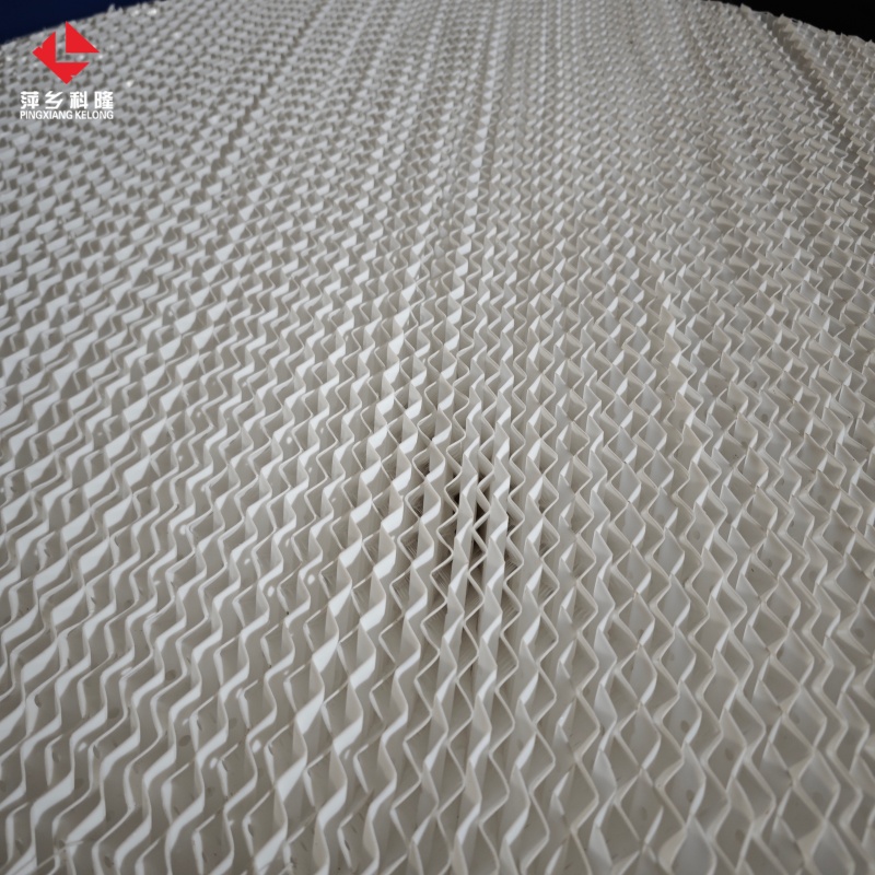 四氟孔板波紋填料是用聚四氟乙烯(PTFE)加工成帶規則波紋與開孔的板片,按相鄰板波紋交叉的方式疊裝成規整模塊;板片波紋角常為30°–60°,內部開孔可強化氣液均布與傳質,空隙率高達93%–95%